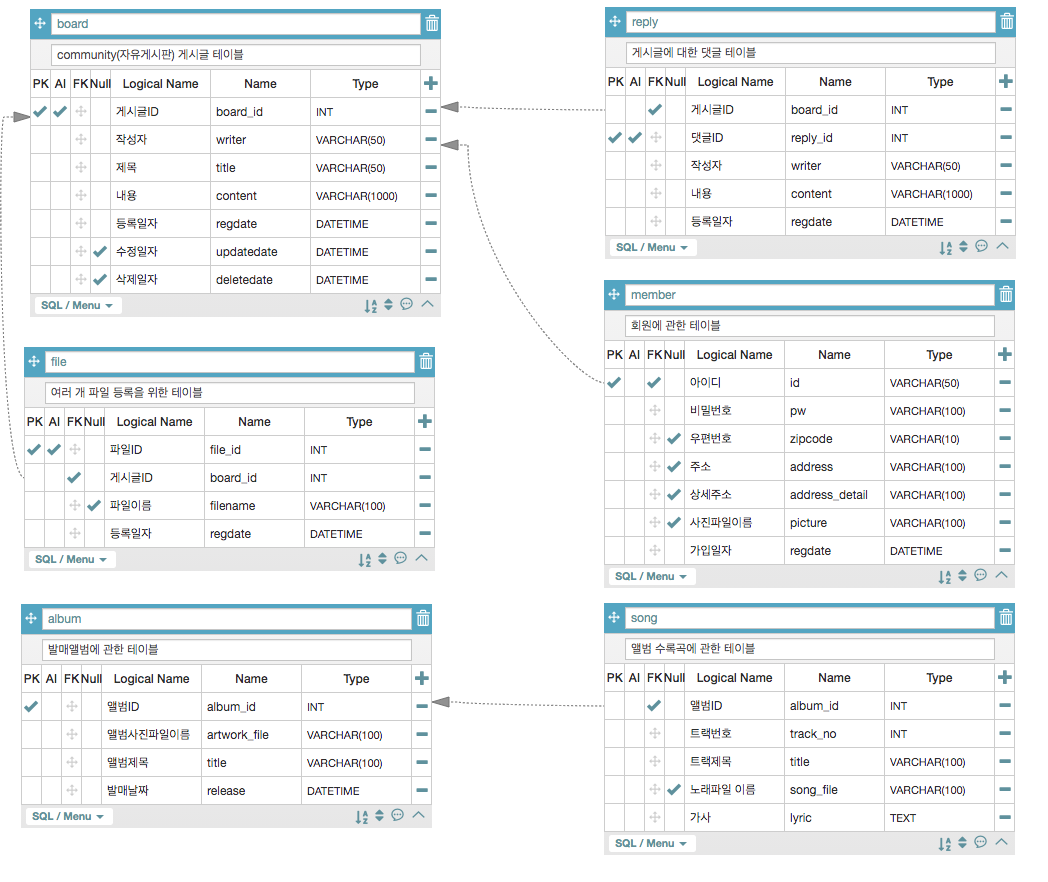 Aquerytool 이용법을 구글에서 간단히 찾아 다음과 같이 ERD설계를 해보았다.