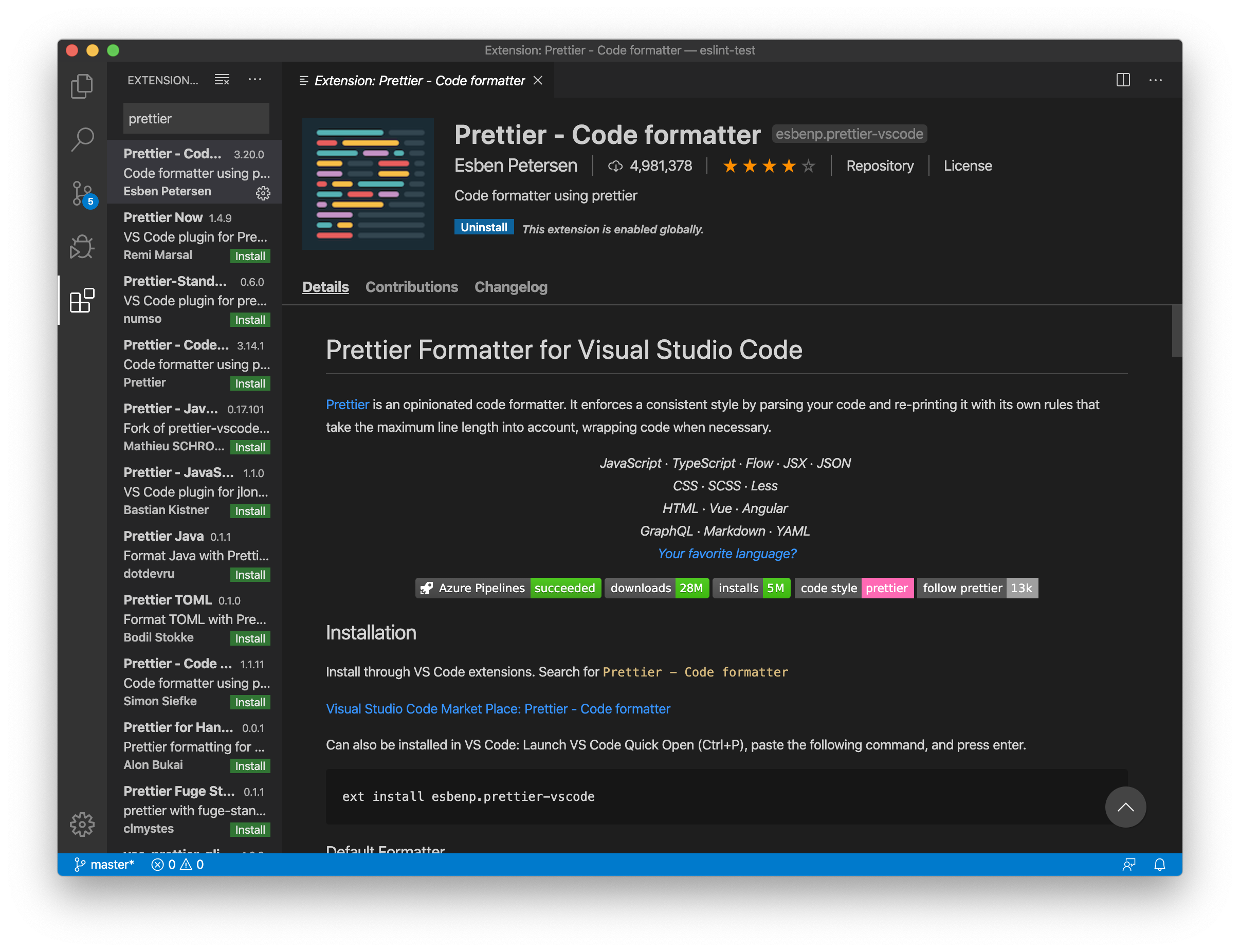 VS Code의 “Extensions: Marketplace”에 들어가서 eslint와 prettier를 검색해 설치.