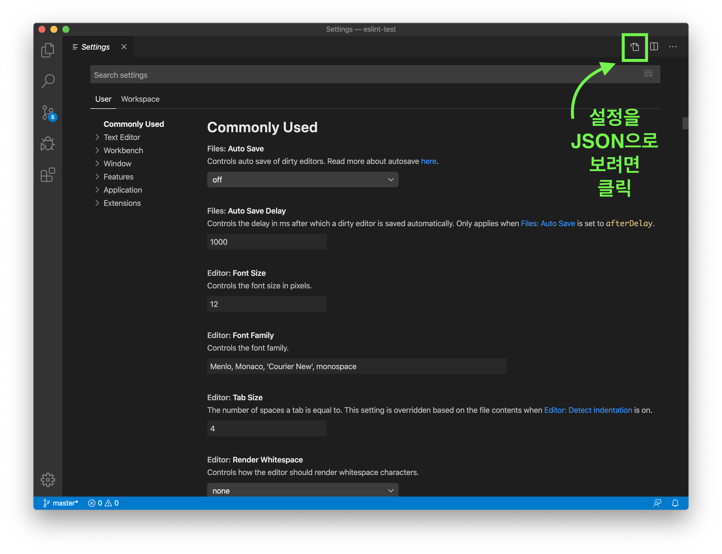 전체 작업공간에 적용. VS Code의 설정파일인 settings.json을 직접 편집.